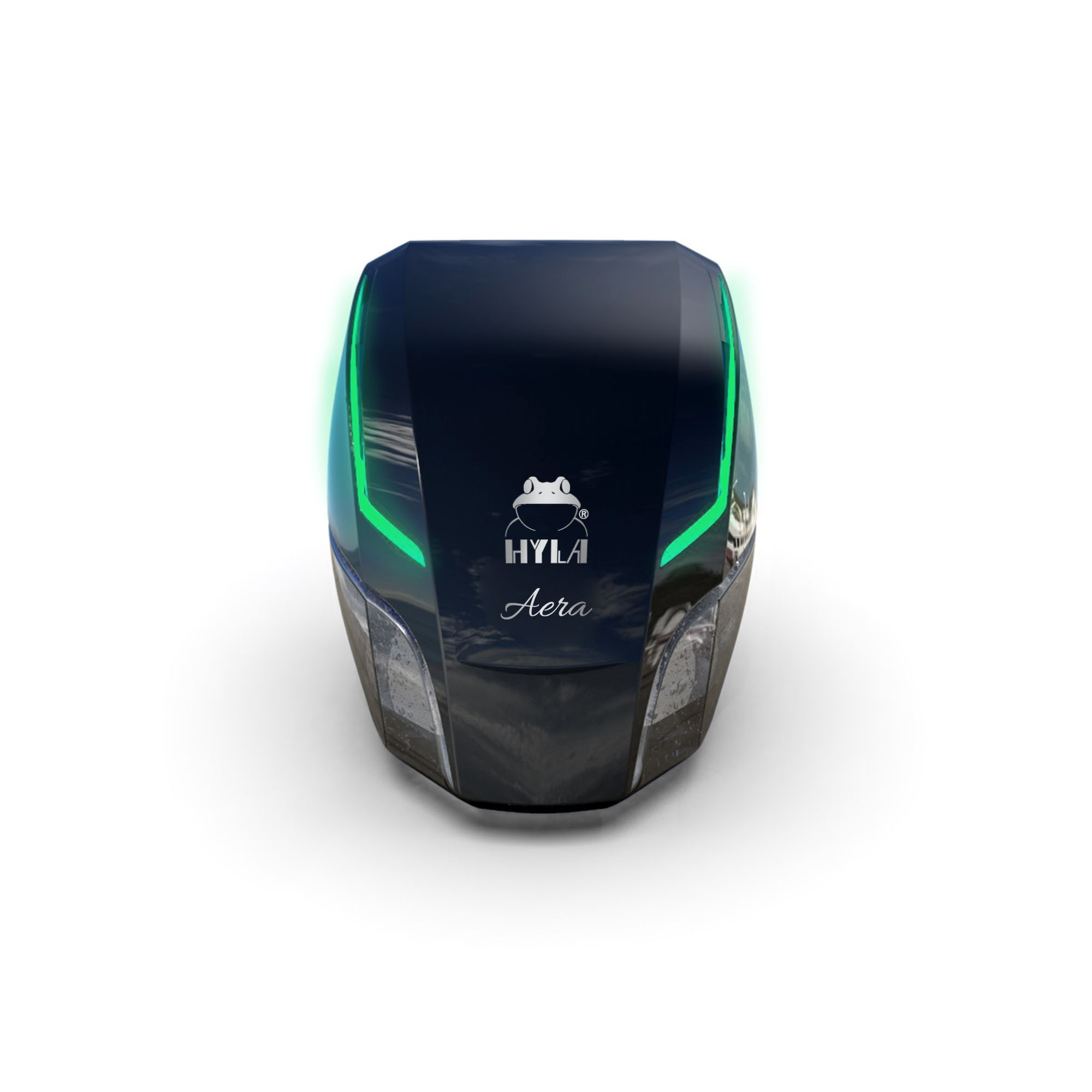 Der AERA Lufterfrischer besteht aus nur zwei Teilen: der Motor-Einheit mit LED-Lichtern und dem Wasserbehälter. Das glänzende schwarze Cover und das zentral platzierte HYLA-Logo machen deutlich, dass es sich um ein neues Produkt von HYLA handelt. Die Neuerung des AERA Lufterfrischers ist die HYLA AERA App, mit der das Gerät über das Smartphone gesteuert werden kann. Die App ermöglicht es dem Nutzer das Gerät zu Aktivieren und aus Millionen von Farben zu wählen oder seinen eigenen Lichteffekt zu kreieren.